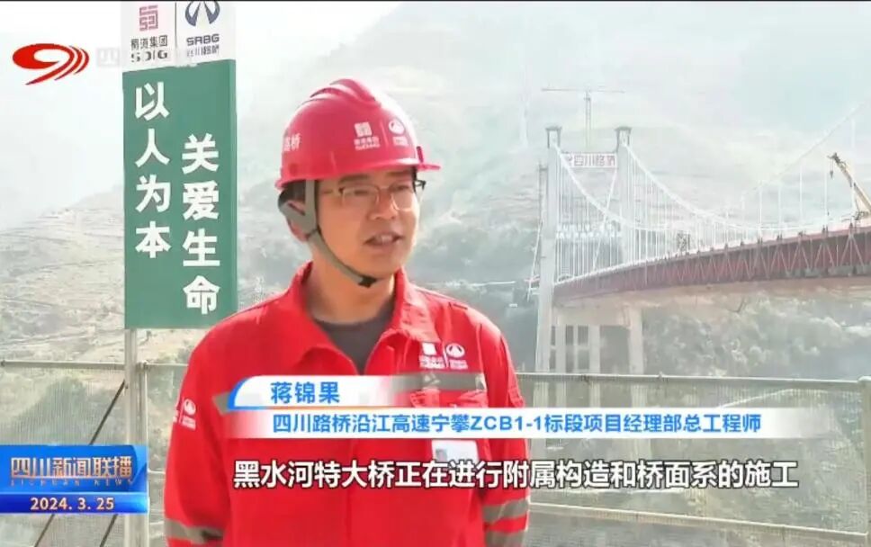 四川路桥沿江高速宁攀ZCB1-1标段项目经理部总工程师 蒋锦果:黑水河特大桥正在进行附属构造和桥面系的施工。接下来,宁攀1标将全力向2024年6月30日的通车目标冲刺!沿江高速建成后,将有效提高成昆交通运输大通道的运输能力,与金沙江航道、G85银昆高速形成综合立体交通运输体系。
